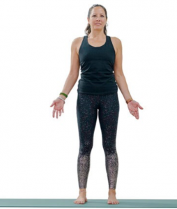Come to stand at the top of your mat in Mountain pose. Bring your palms together in front of your heart for Anjali Mudra. The base of the hands touch at the bend of the wrist; the thumbs and little fingers stay connected.