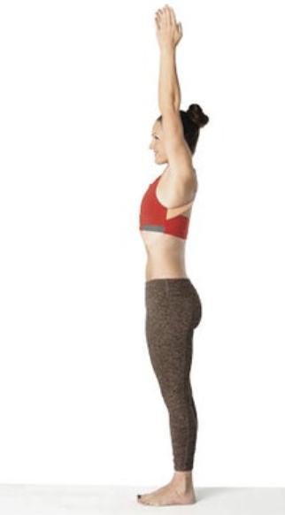 On an inhale, reach the arms overhead; fingertips come to touch. As you exhale, gently press your palms toward the earth; the fingertips stay connected. Repeat this movement three to 10 times, slowing down the exhale as you progress.