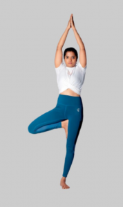 Ground down through your right leg and place the sole of the left foot on the inside of the right leg for Tree pose. The left foot rests either on the shin or on the thigh, above the knee. Just make sure that the foot is not pressing into the knee joint. You can reach your arms overhead or keep them resting on your hips. Whichever arm variation you choose, make sure that the arms are moving away from the midline in order to air out the sides of the waist and your armpits. Hold Tree pose for five to 10 breaths.