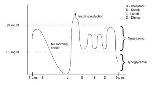 Amongst other points, Dr. Mick emphasizes that the best dietary regimen involves eating early and often. We’ve all heard that it is healthier to eat 6 small meals rather than 3 big ones, and intuitively, that makes sense. However, few people understand why the reason for this is, and Dr. Harpaz does a great job explaining why. To do so, he delves into different case studies and provides charts such as the one below, where blood sugar levels are related to times and size of meal consumption.