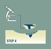 Step 4- The edges of the skin sample are examined under a microscope, and evidence of cancerous cells are noted on the map. Once the sample has been 100% examined, the Mohs surgeon returns to the patient and, using the map, he removes additional layers of skin from the regions where evidence of cancerous cell roots exist.